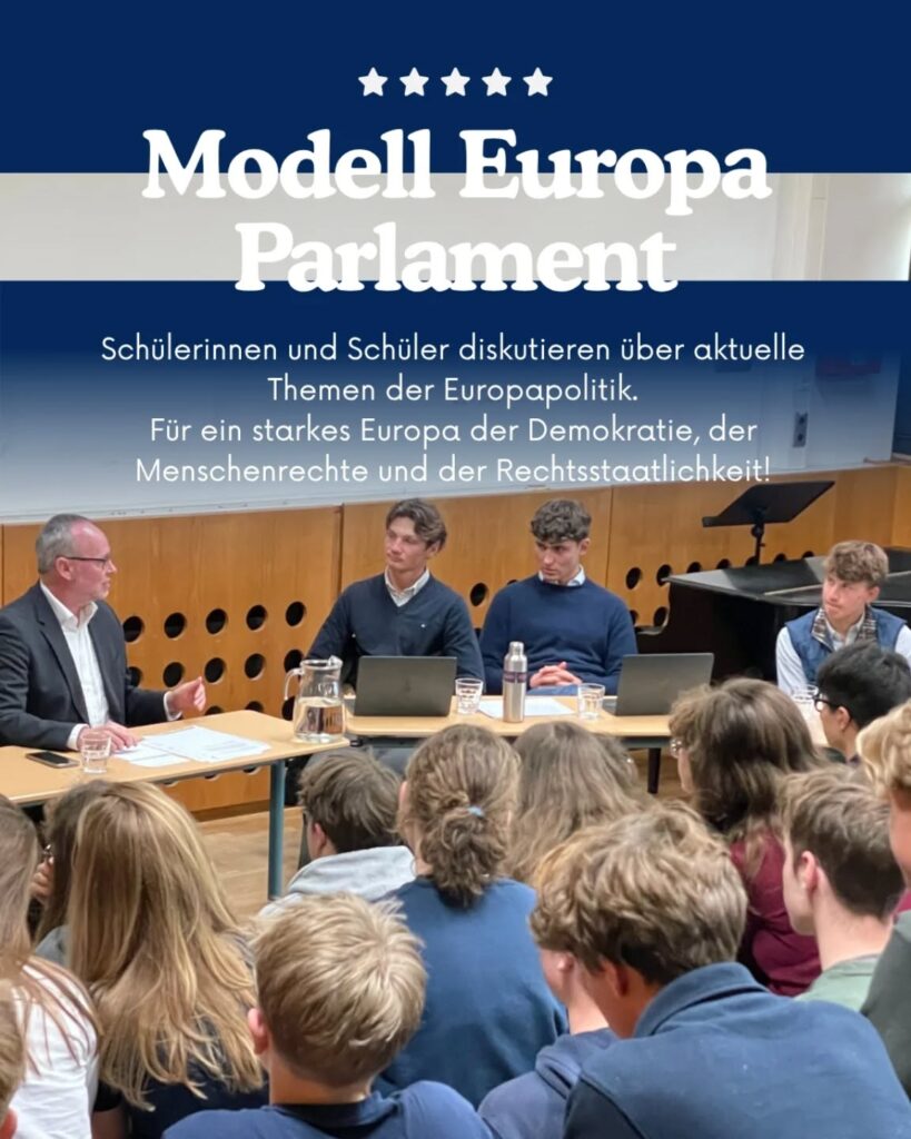 Schülerinnen und Schüler tauschten sich engagiert mit dem Hamburger Bürgerschaftsabgeordneten Sören Schumacher über aktuelle politische Themen und die Bedeutung europäischer Zusammenarbeit aus.