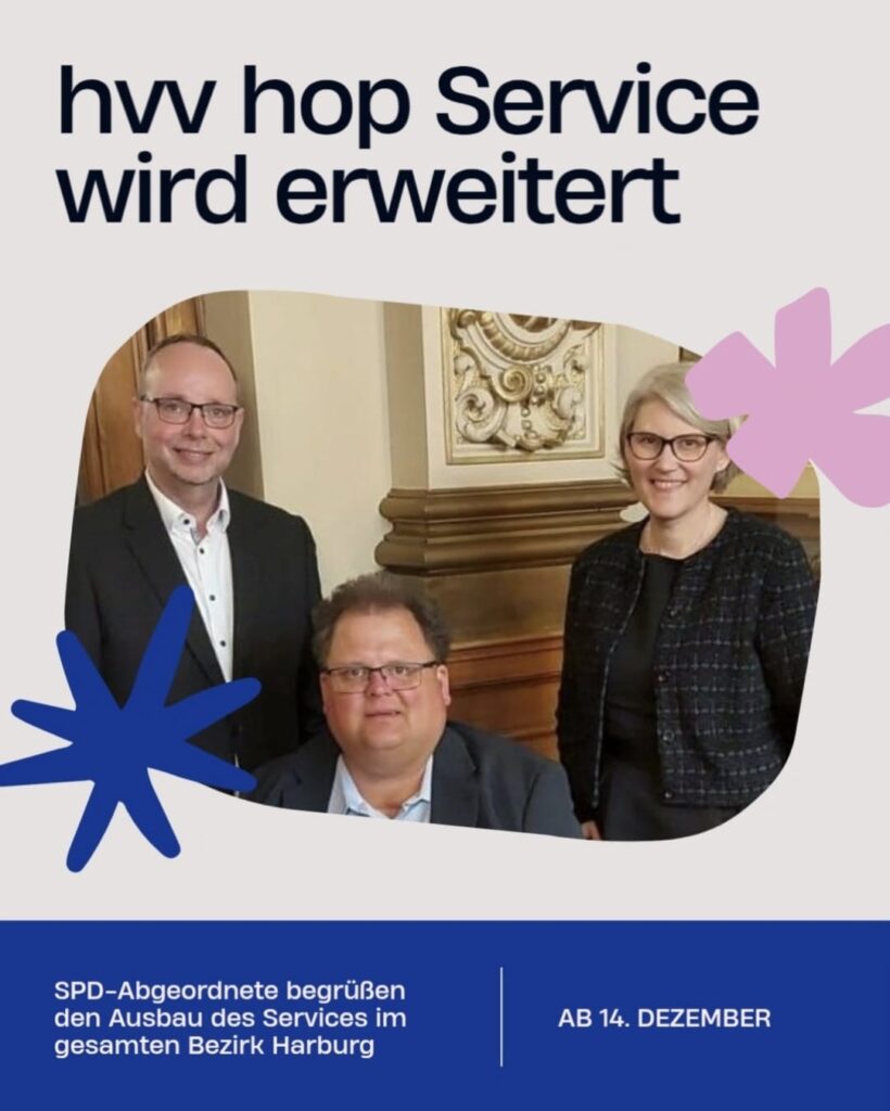 Ab dem 14. Dezember 2025 fährt hvv hop im gesamten Bezirk Harburg. Die drei Harburger SPD-Bürgerschaftsabgeordneten Matthias Czech, Claudia Loss und Sören Schumacher begrüßen die deutliche Verbesserung der Mobilität vor Ort und sehen darin einen wichtigen Schritt für gleichwertige Lebensverhältnisse in allen Stadtteilen.