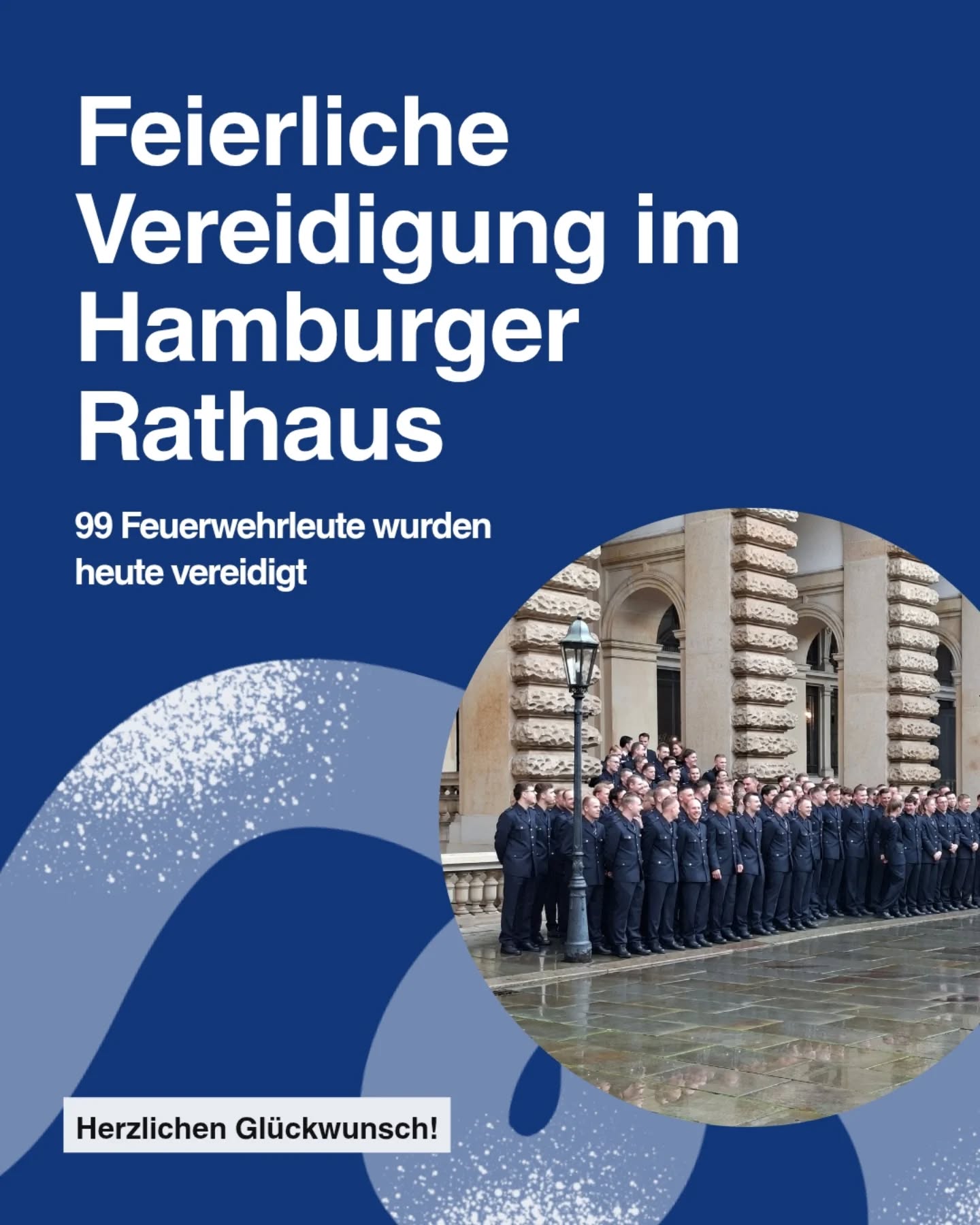 Am 22. Oktober 2025 wurden im Hamburger Rathaus 99 neue Feuerwehrleute durch Innensenator Andy Grote vereidigt. Herzlichen Glückwunsch an alle neuen Kameradinnen und Kameraden! Mit euch ist Hamburgs Feuerwehr bestens für die Zukunft aufgestellt – für Sicherheit, Zusammenhalt und Einsatzbereitschaft in unserer Stadt.