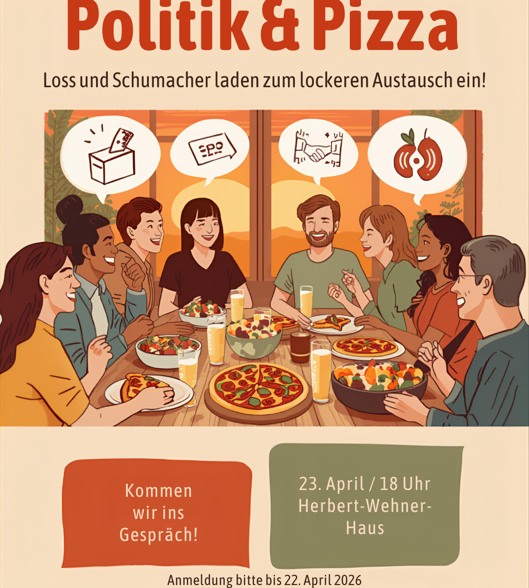 Der nächste Pizza-Abend findet statt am Donnerstag, den 23. April 2026, um 18 Uhr in der SPD-Zentrale im Herbert-Wehner-Haus in der Julius-Ludowieg-Straße 9, 21073 Harburg.